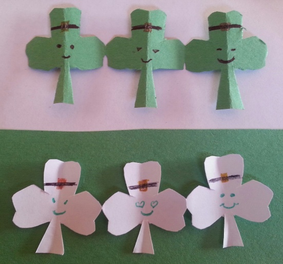 The shamrock chain is made the same as a paper doll chain or snow flake chain: folding up paper and cutting half the symbol. I found green construction paper to thick to make a very long chain. Thin green paper or plain white paper can be used.